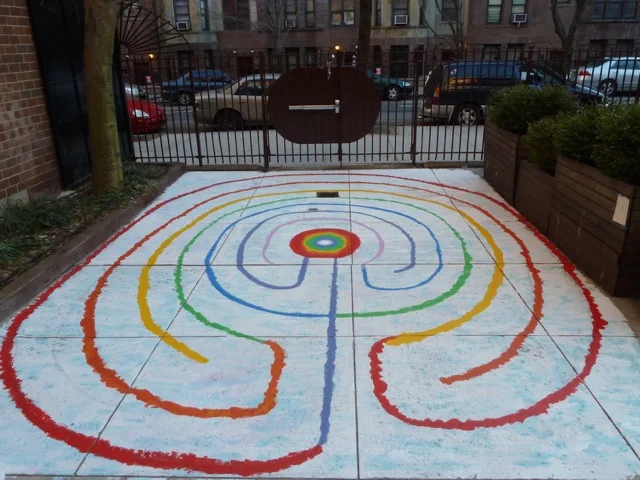 When I was asked to design a labyrinth for the Lilian Webber School of the Arts, PS 84, in New York City, I combined the seven circuit labyrinth pattern with the seven rainbow colors of the chakras. The Rainbow Chakra labyrinth is publicly accessible as the school shares space with Sol Bloom Park, Manhattan, New York City.